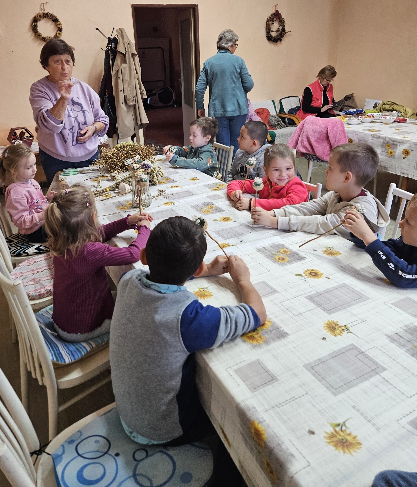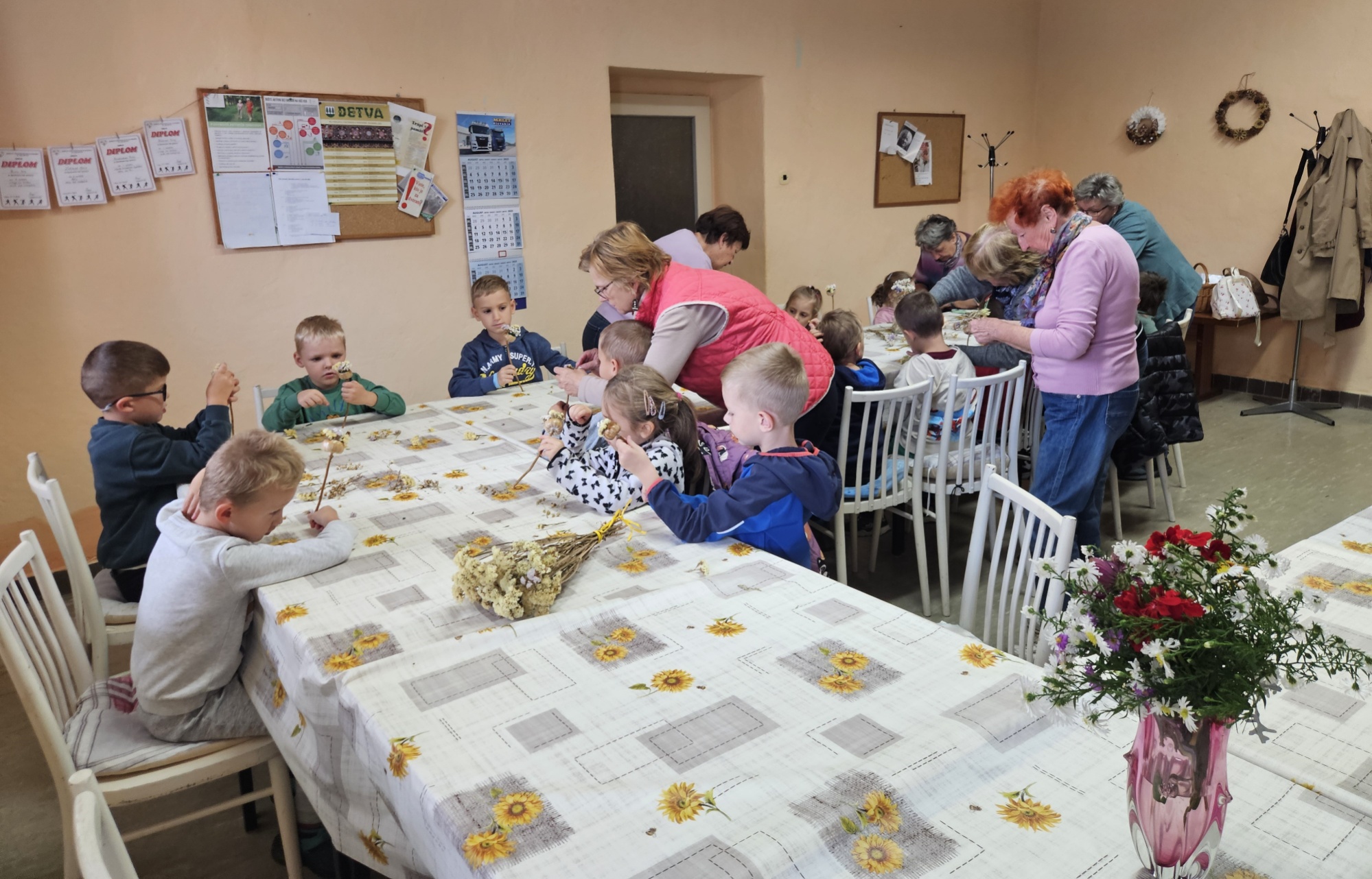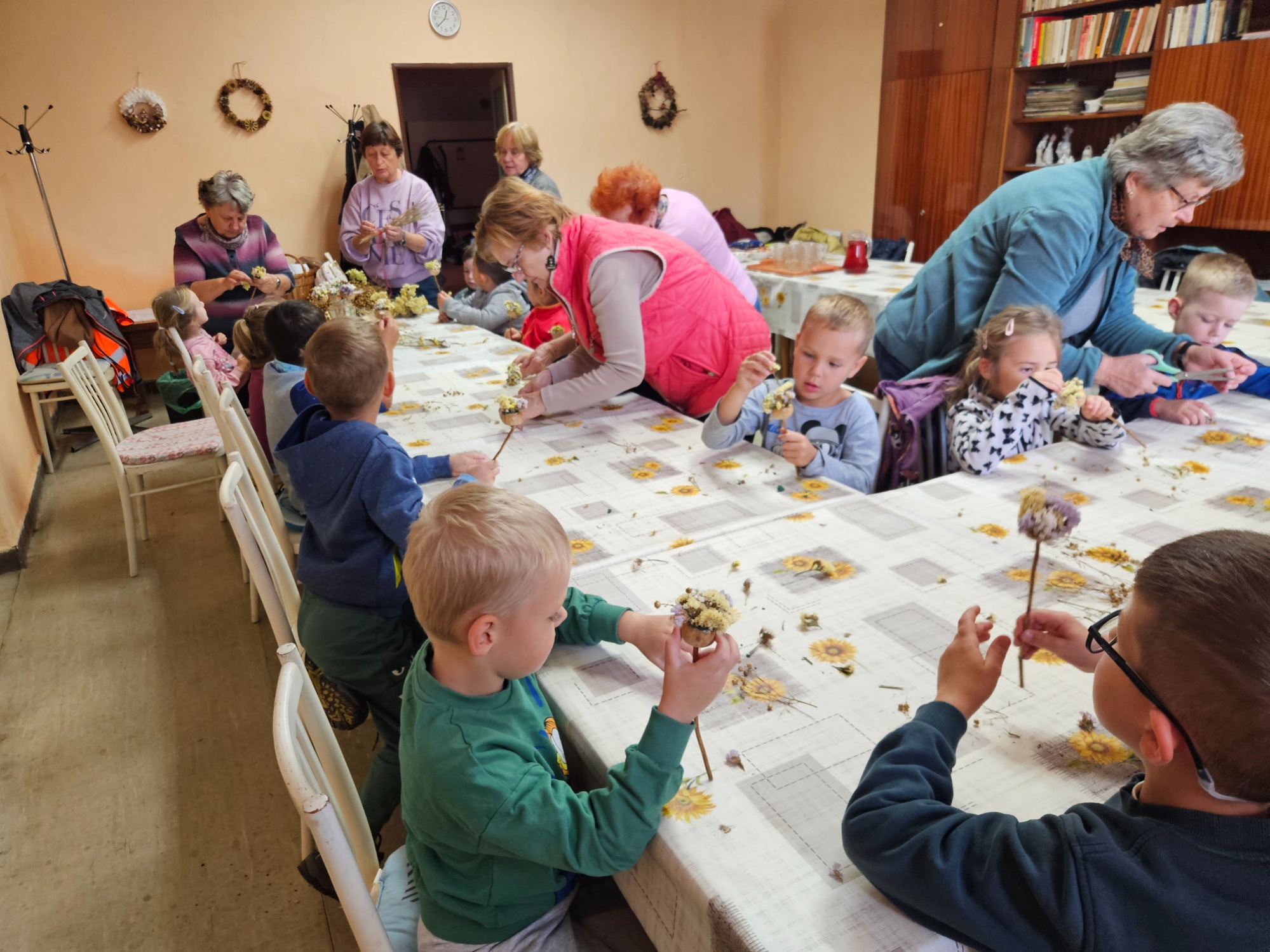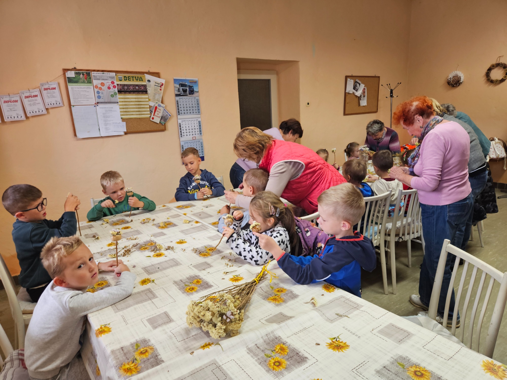 Na úvod sa deti predstavili s krátkym kultúrnym program – zaspievali piesne a zarecitovali básne, čím potešili všetkých prítomných. Potom nasledovali tvorivé dielne, kde z makovičiek, sušených kvetov a ľanu vytvárali prírodné kytičky pre svojich starých rodičov. Milé tety pripravili aj sladké pohostenie so šípkovým čajom. Po občerstvení nasledovalo spoločné hranie hier, spev a tanec, ktoré všetkým priniesli radosť a úsmev na tvári. Deti sa vrátili do materskej školy plné nových zážitkov a dojmov s pocitom radosti z príjemne stráveného dopoludnia so seniorkami z Denného centra.