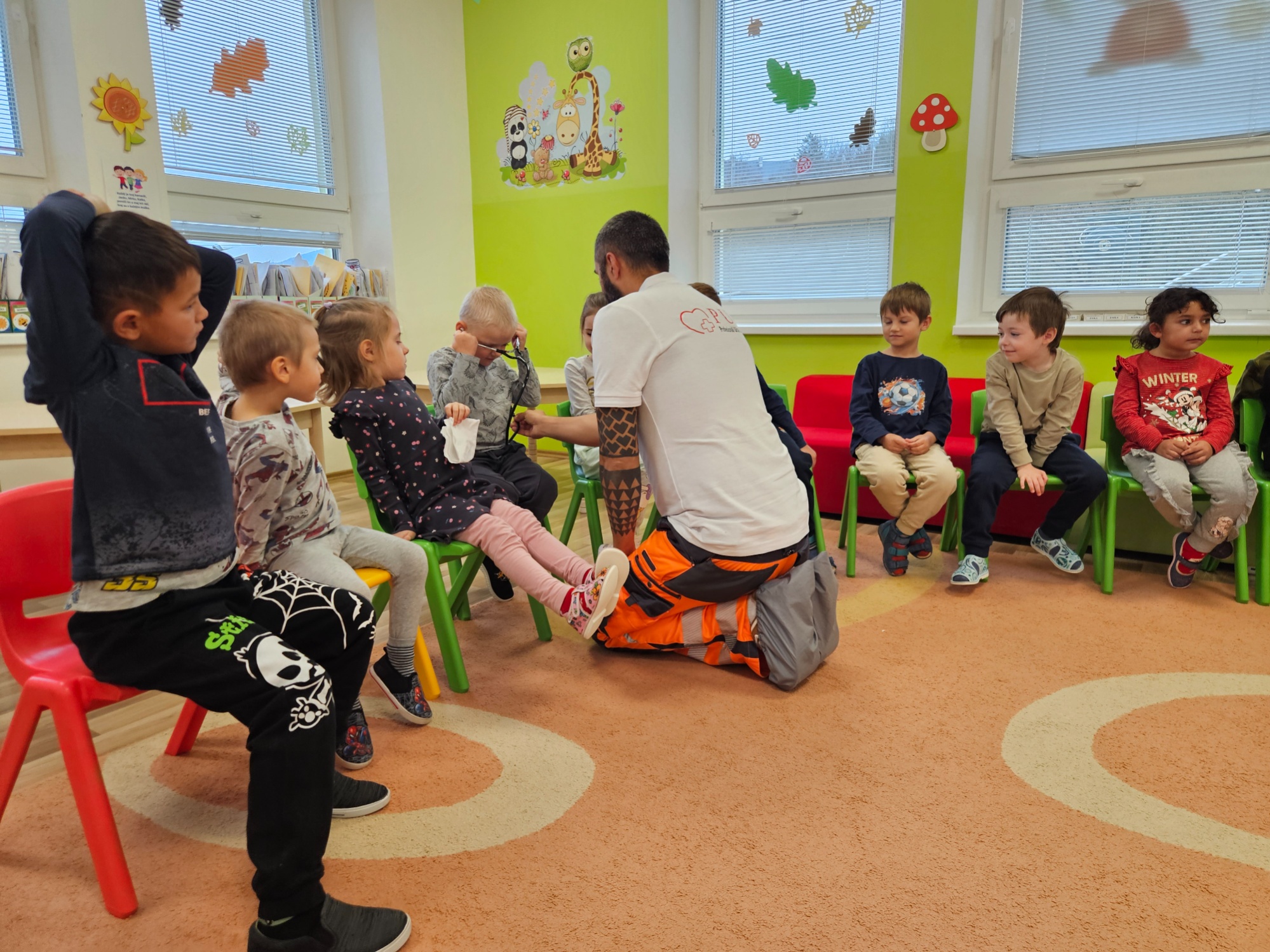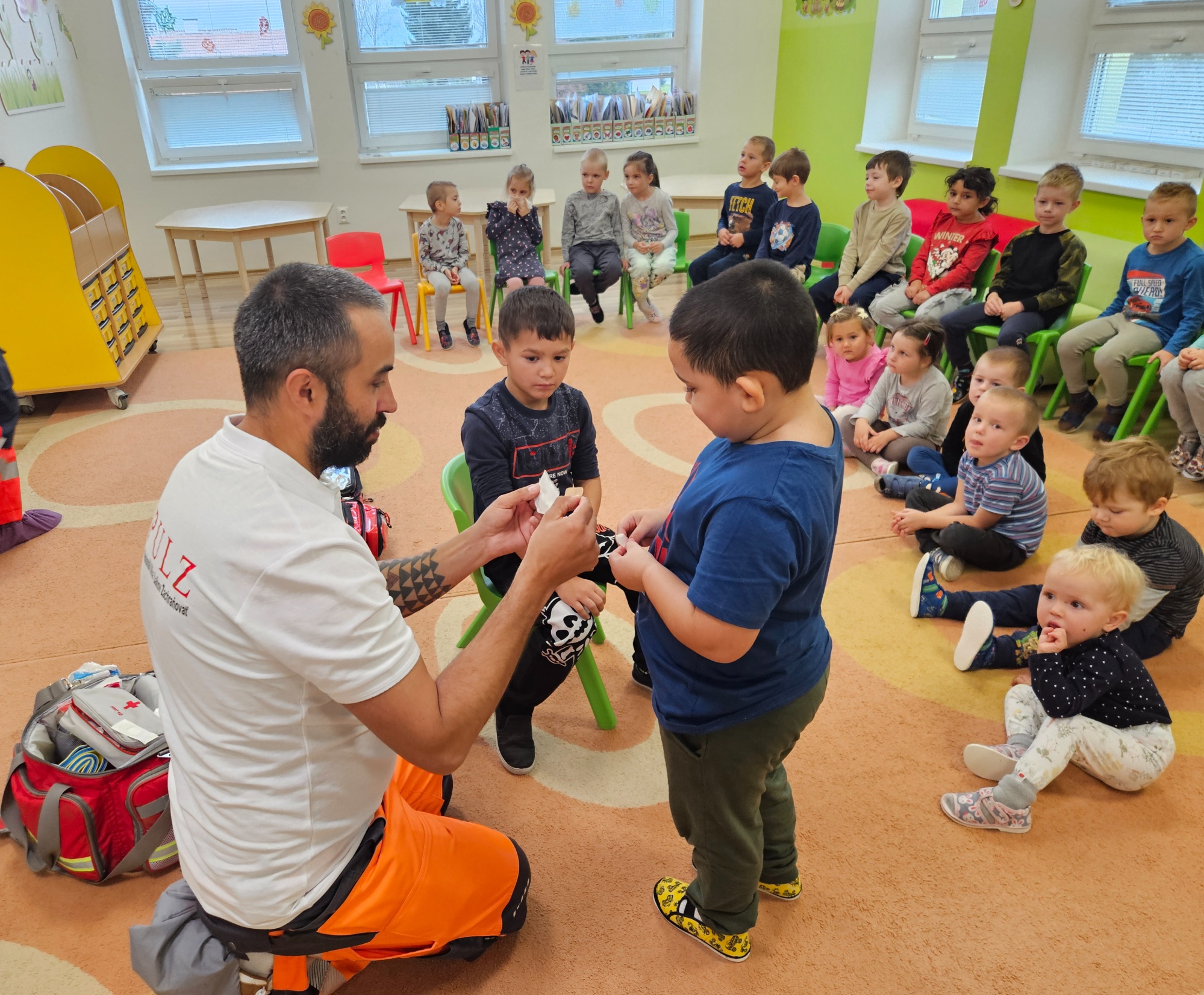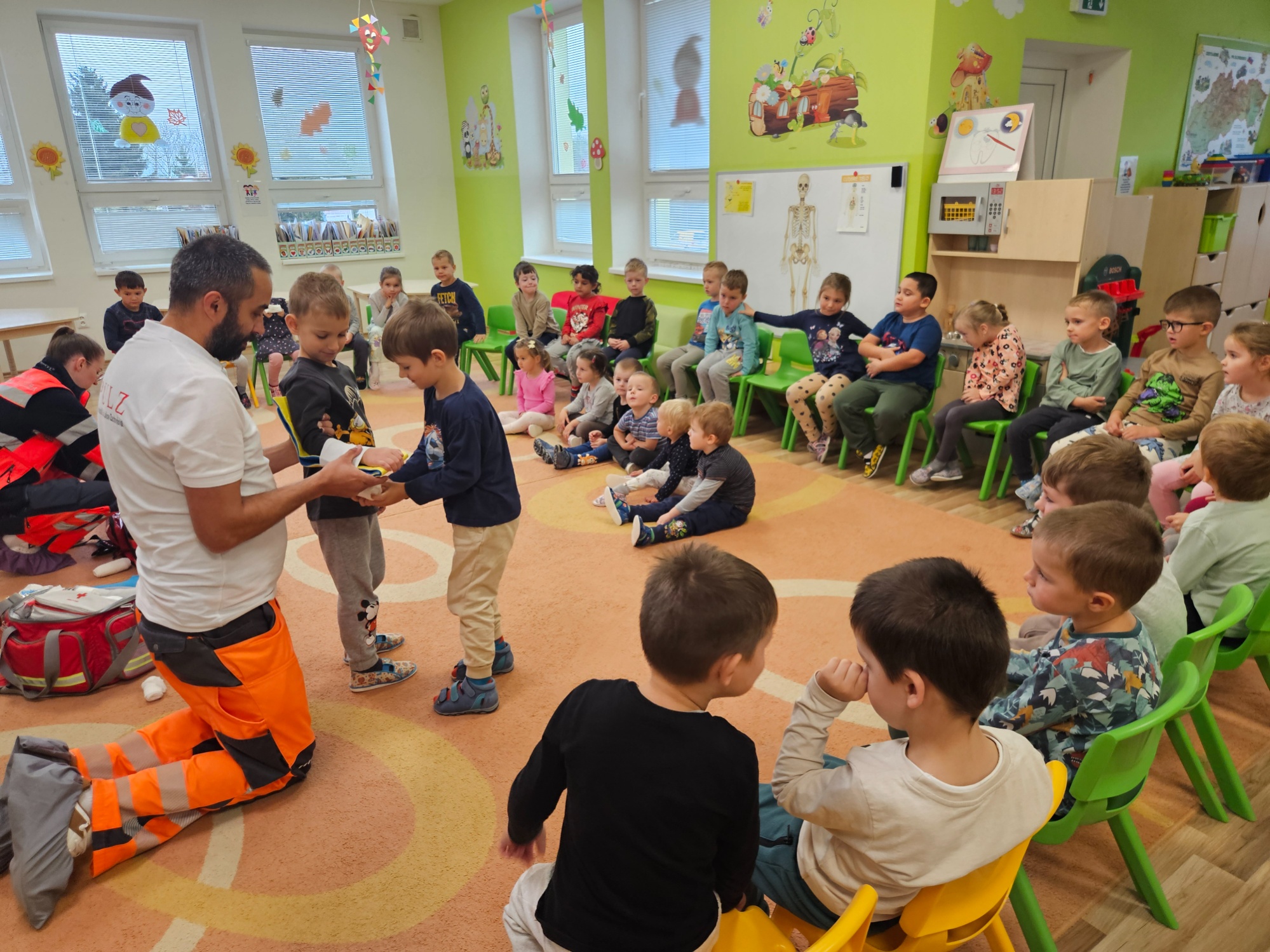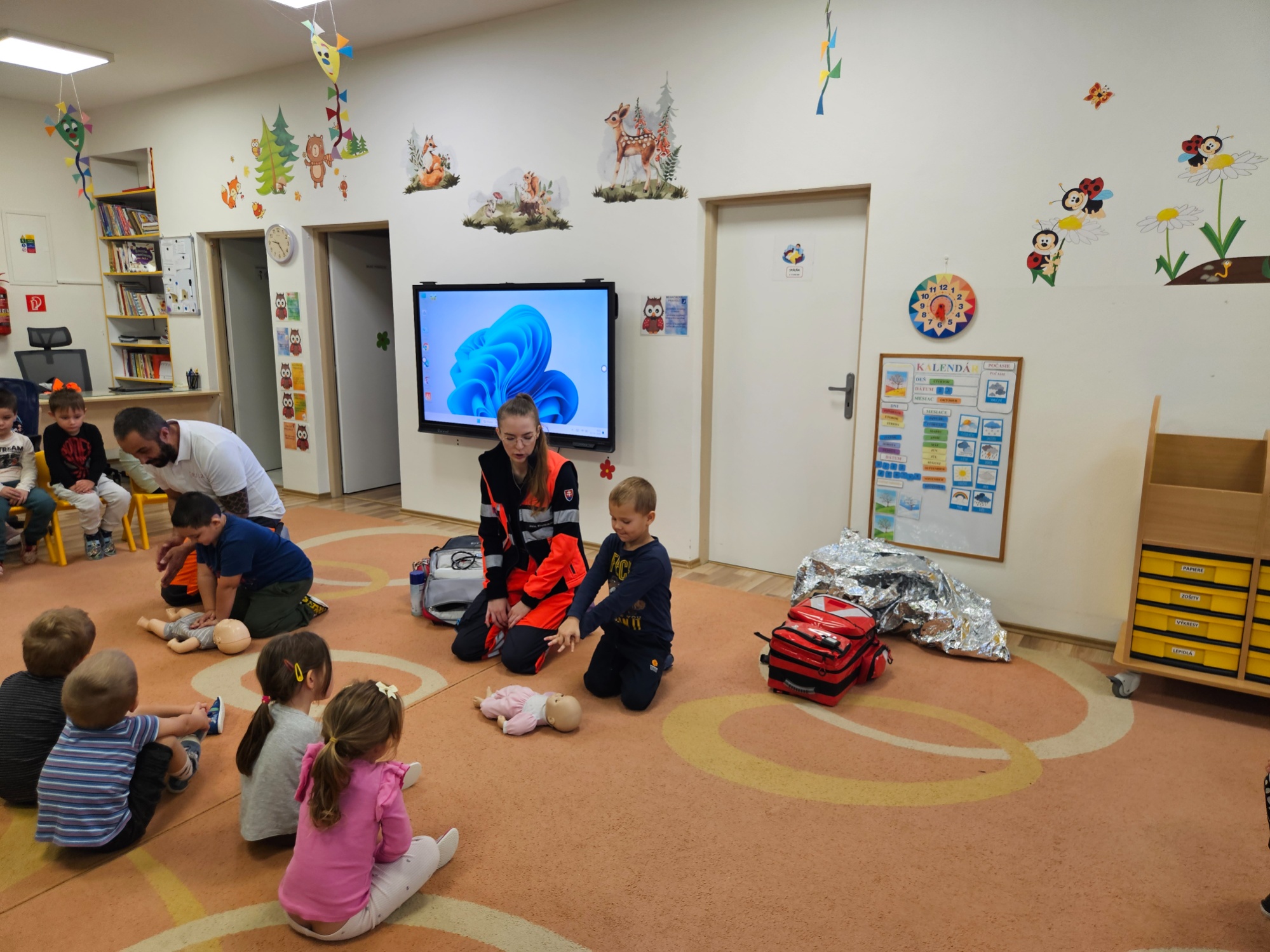 Deti sa zoznámili so základnými zdravotnými pomôckami potrebnými pri poskytovaní prvej pomoci (napr. obväzy, náplasti, dezinfekcia, trojrohá šatka) a videli ukážky zásahov prvej pomoci Toto milé a poučné stretnutie ich veľmi zaujalo. Aktívne sa zapájali, kládli množstvo zvedavých otázok a s veľkým záujmom si vyskúšali poskytovanie prvej pomoci. Ďakujeme záchranárom Janke a Maťovi za ich čas, ochotu a inšpiratívnu návštevu v podobe nových poznatkov.