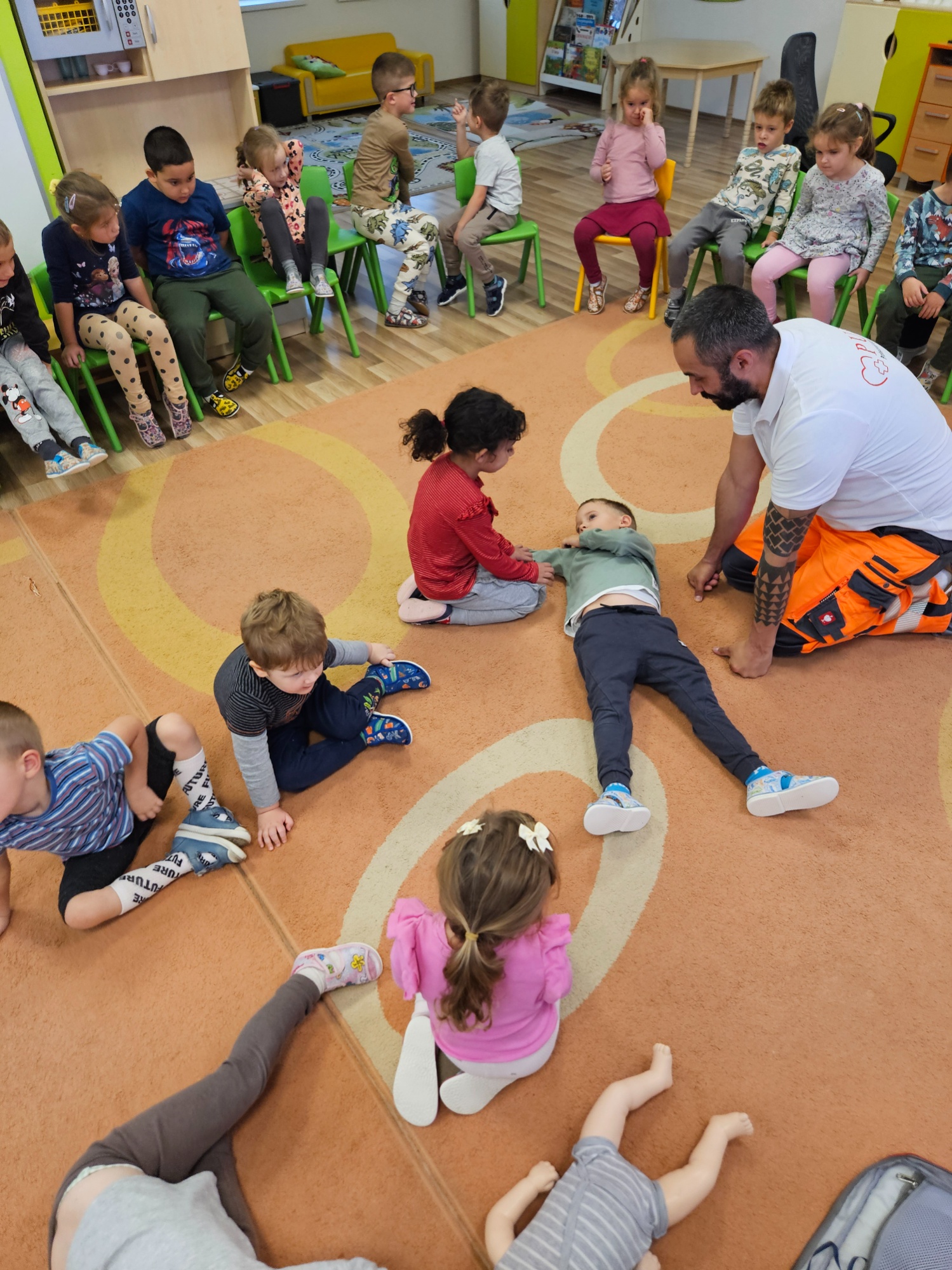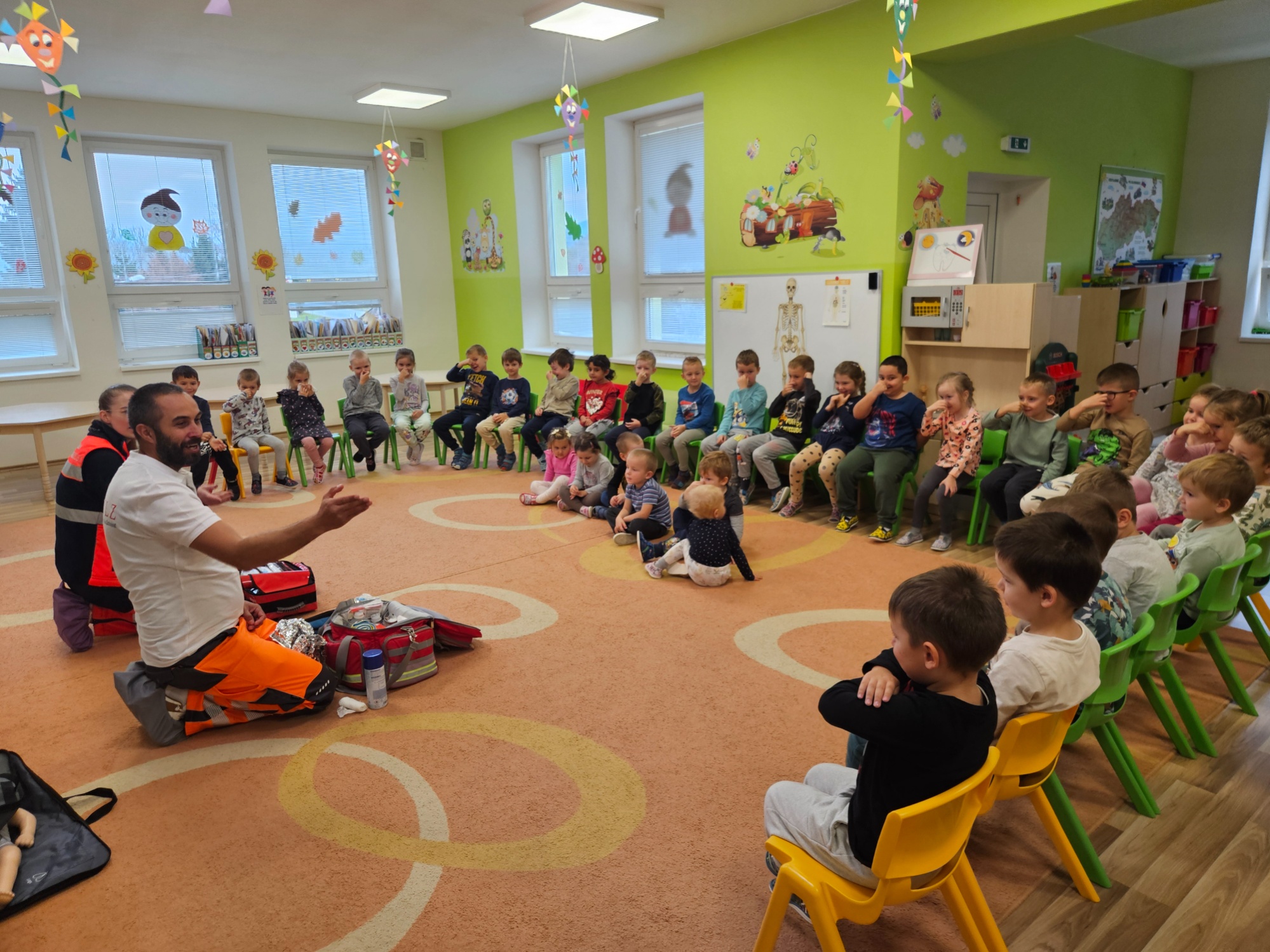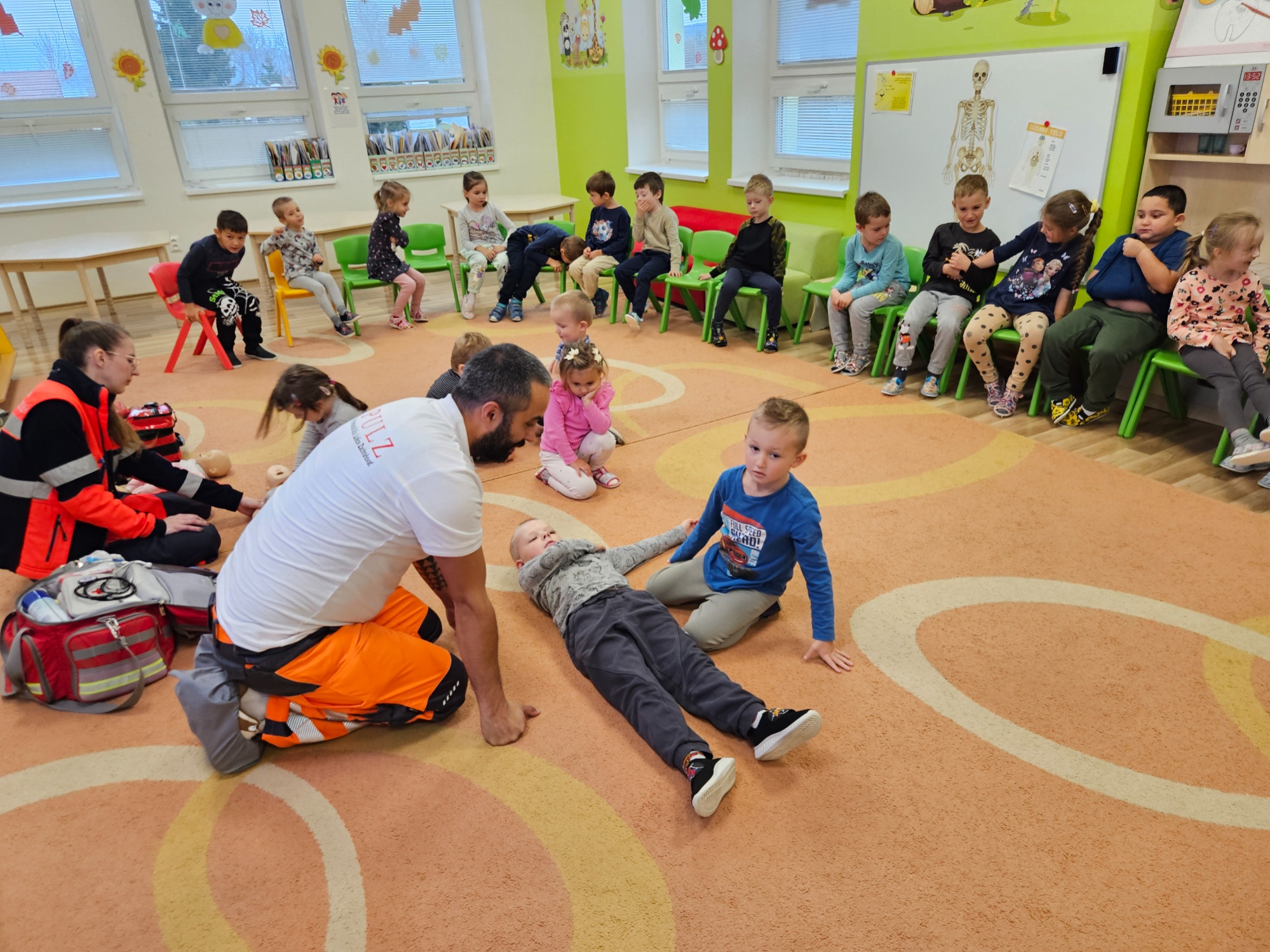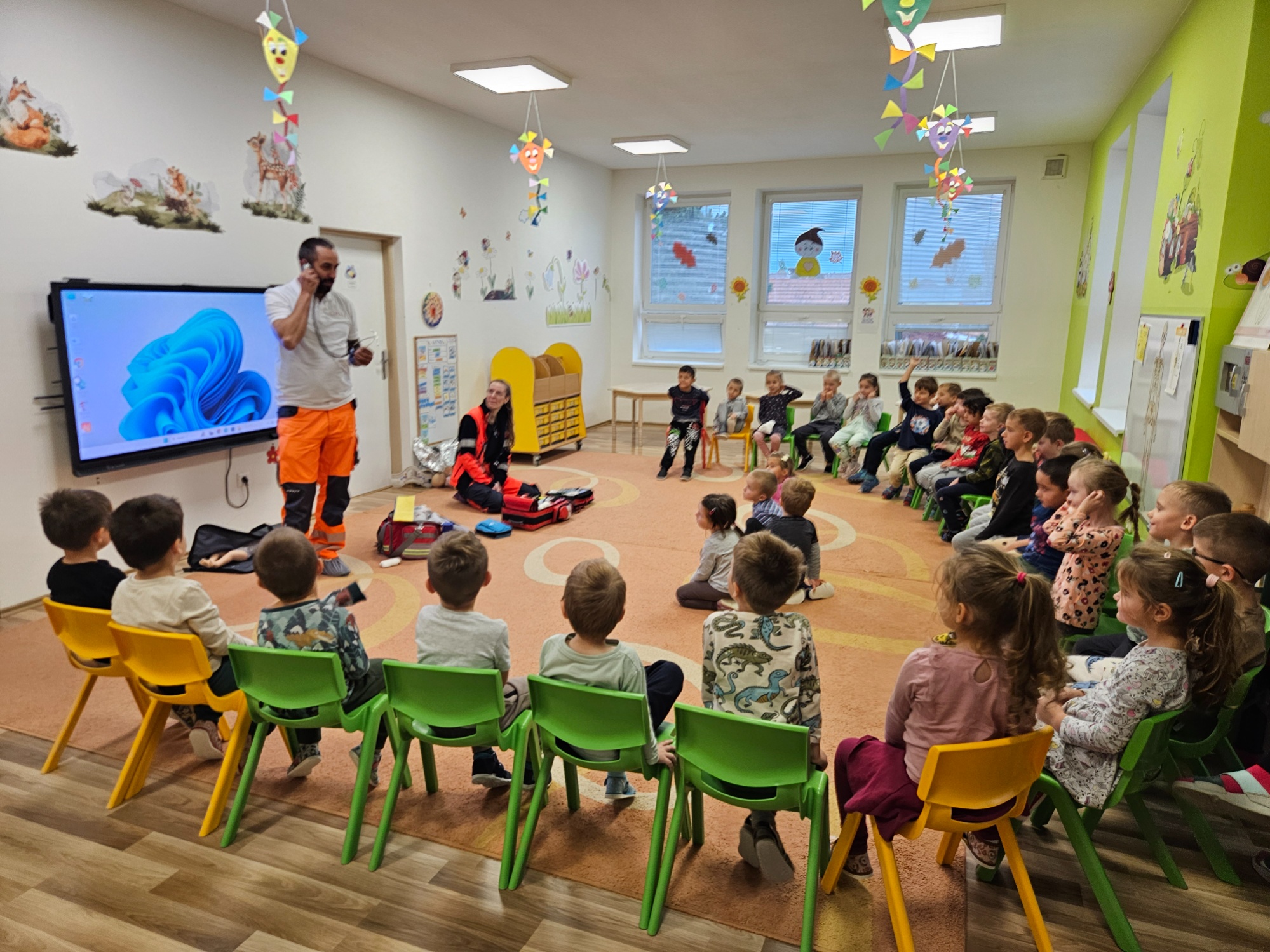 Deti sa zoznámili so základnými zdravotnými pomôckami potrebnými pri poskytovaní prvej pomoci (napr. obväzy, náplasti, dezinfekcia, trojrohá šatka) a videli ukážky zásahov prvej pomoci Toto milé a poučné stretnutie ich veľmi zaujalo. Aktívne sa zapájali, kládli množstvo zvedavých otázok a s veľkým záujmom si vyskúšali poskytovanie prvej pomoci. Ďakujeme záchranárom Janke a Maťovi za ich čas, ochotu a inšpiratívnu návštevu v podobe nových poznatkov.